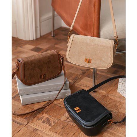 フェイクレザーとスウェードの異素材デザインが印象的。
