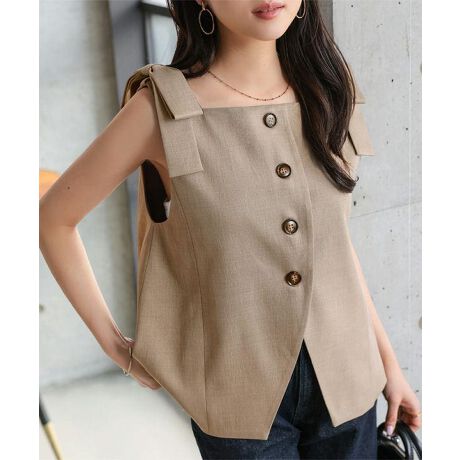 ジレのような前開きデザインでありながら、ノースリーブのトップス感覚で着用できるデザイントップス。