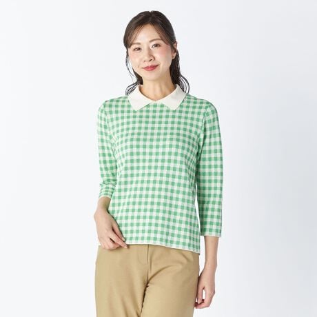 大人ガーリーな着こなしをかなえてくれるギンガムチェック柄のプルオーバーニットです。ポリエステル×コットンの軽やかなニット素材と手首がのぞく短めの袖丈で、インナーとしても着まわししやすくロングシーズンお使いいただけます。レイヤード風にデザインした配色切り替えの衿もアイキャッチな1着です。
