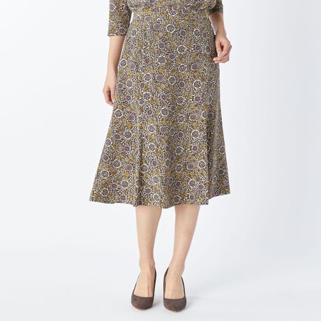 個性派な着こなしをかなえてくれる、フラワー&リーフモチーフのプリント柄スカートです。裾にかけてふわりと広がるフェミニンなシルエット、膝が隠れるくらいのミディ丈が上品な着こなしをかなえてくれます。ウエストの後ろはゴム切り替えですっきり快適。同柄のブラウスとセットアップでそろえるのもおすすめです。