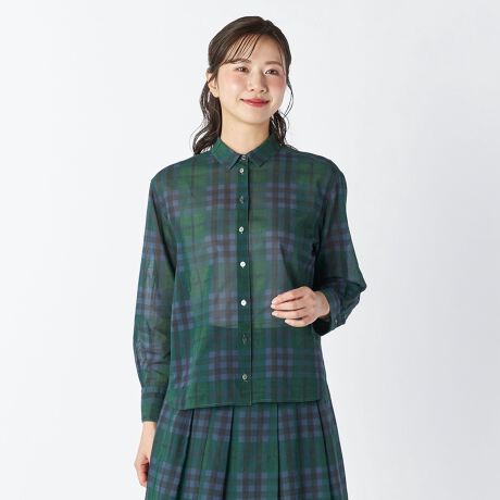 大人トラッドな着こなしがかなうチェック柄のブラウスです。オーガンジー素材ならではのさりげない光沢感のある軽やかな着用感で、カジュアルになり過ぎない柄スタイルが楽しめます。1枚ではもちろんカーデやジャケットのインナーとしても存在感があっておすすめ。同柄のパンツとセットアップでそろえたいアイテムです。