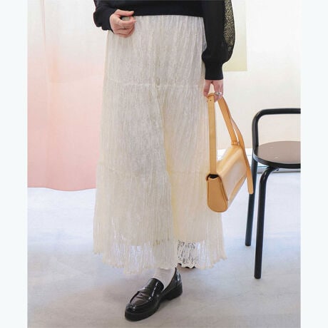・繊細なレースのような素材感が魅力のプリーツロングスカート・軽やかに揺れるシアーな生地が、自然光を受けてやさしく表情を変える・ウエストは総ゴム仕様でリラックスした穿きごこち・Tシャツやスウェットなどを合わせてカジュアルダウンさせるコーデもおすすめ◎・ナチュラルでやわらかなムードを纏える、季節を問わず活躍する1枚[型番:AHXT0518]