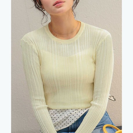 ・ランダムリブが縦ラインを強調し、すっきり華奢見えを叶えるシアーニットトップス