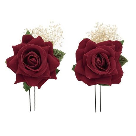 花びらが繊細なビロード生地で作られたバラの花に、かすみ草が添えられた優美なデザインです。