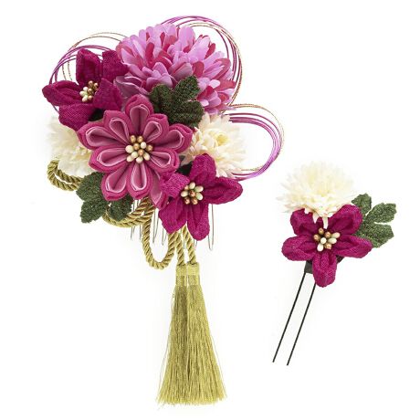 縮緬(ちりめん)地のつまみ細工と艶やかな生地の菊にピンポンマム、水引や金色の組紐が施され、房飾りが揺れる華やかなデザインです。