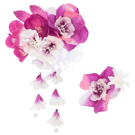 ハリのある異素材の花びらを重ねた、ブーケのような大サイズと小サイズの2つがセットになったヘアアクセセットです。