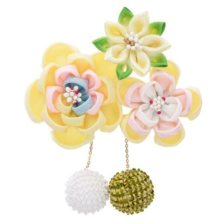 つまみ細工で作られた梅の花や桜の花に、歩くたび揺れる絞りの飾り玉が施されています。