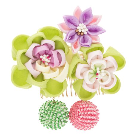 つまみ細工で作られた梅の花や桜の花に、歩くたび揺れる絞りの飾り玉が施されています。