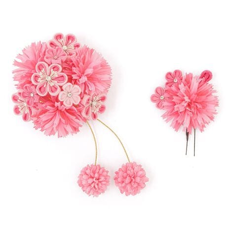 幾重にも花びらを重ね、ボリュームのある大サイズと小サイズの2つがセットになったヘアアクセセットです。