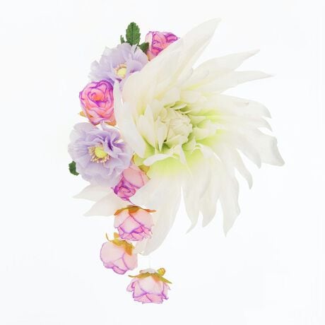 優雅に開く大きな花に、椿(ツバキ)や薔薇(バラ)の小花を添えた髪飾りです。