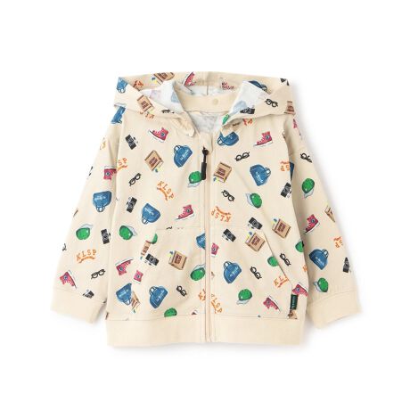 お好みでフードを取り外せる長袖パーカです。アメリカンカレッジをイメージしたスニーカーやバッグなどのモチーフを、ヴィンテージな雰囲気でデザイン。接触冷感やUVカットなど、機能性が充実しているのも魅力です。パンツ(品番:5361103)と合わせれば、セットアップとして統一感のあるコーディネートが楽しめます。内側にお名前を記入できるタグつき。