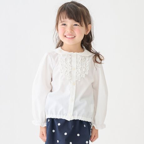 胸元のフリルデザインが目を引くさわやかなブラウスです。