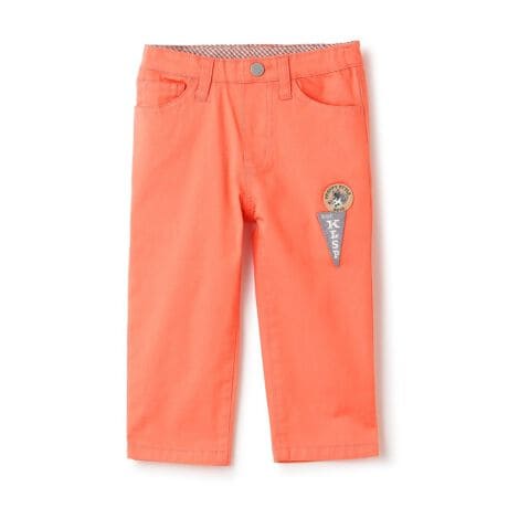 オオカミとペナントのアップリケをあしらったカレッジ風デザインが魅力のロング丈パンツです。後ろポケットはオオカミの織りネームつきで、細部までこだわりました。縫い代はパイピング仕上げで、折り返すとおしゃれなアクセントをプラス。内側にお名前を記入できるタグがついています。【おすすめの着用時期は春夏シーズン】