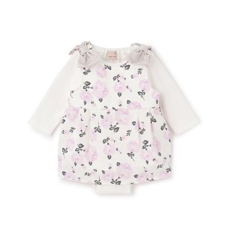 肩の大きなリボンがかわいいワンピースとロンパースのセットアップです。