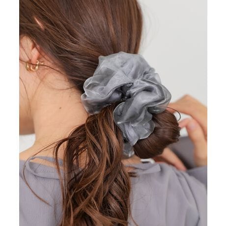 透け感のあるオーガンジーと、上品な光沢感のサテンを組み合わせたシュシュ。異素材のコントラストが、シンプルながらも存在感のあるデザインに仕上げています。程よいボリューム感で、まとめ髪にさっとプラスするだけで女性らしいニュアンスを演出。デイリーからちょっとしたお出かけまで、幅広いシーンで活躍するアイテムです。