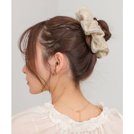 透け感のあるオーガンジーと、上品な光沢感のサテンを組み合わせたシュシュ。異素材のコントラストが、シンプルながらも存在感のあるデザインに仕上げています。程よいボリューム感で、まとめ髪にさっとプラスするだけで女性らしいニュアンスを演出。デイリーからちょっとしたお出かけまで、幅広いシーンで活躍するアイテムです。