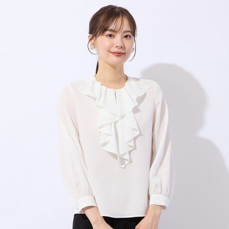 前衿をエレガントなラッフル衿で飾ったブラウス。女性らしくフェミニンな雰囲気。