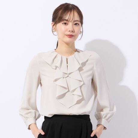 前衿をエレガントなラッフル衿で飾ったブラウス。女性らしくフェミニンな雰囲気。