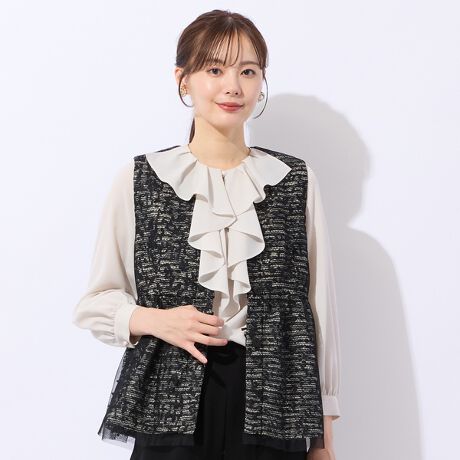 セレモニーなどの華やかなシーンにおすすめのアイテム。クラシカルな印象のツイードに繊細なチュールを重ね、ベストに仕立てています。