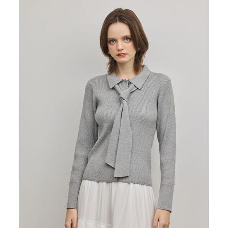 [型番:0326153320]合繊素材。ニット衿のついたリブ編みニットトップス。ボディ同色のニットタイ付き。※こちらのモデル着用画像はサンプル品を撮影しております。実際の商品と仕様、加工、サイズが若干異なる場合がございます。予めご了承くださいませ。