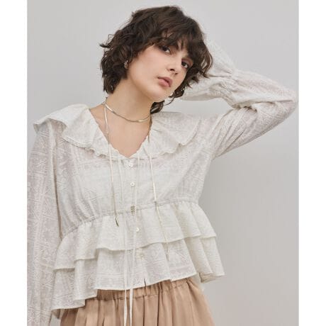 [型番:0126141106]柔らかいコットンボイル地にオリジナルのキカ模様をクロスステッチで刺繍したフリルブラウス。同シリーズでおつくりしたティアードエンブロイダリースカート【品番:0126121106】のご用意もございます。※こちらのモデル着用画像はサンプル品を撮影しております。実際の商品と仕様、加工、サイズが若干異なる場合がございます。予めご了承くださいませ。