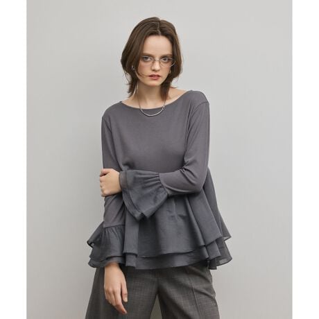 程よいシアー感のある合繊素材を、ティアード状にドッキングしたカットトップ。 着心地の良いカットソー素材に、ほんのり透け感のあるシルキーなタッチのブラウス地をレイヤードしたデザイン。ギャザーを入れながらたっぷりと用尺を取り、更に2段に重ねて生地分量を贅沢に使う事で軽やかに動きを持たせたティアードフリルが、春のムードを盛り上げます。 背中に向かってカーブさせながら切り替える事でトレンドのペプラムシルエットを思わせ、女性らしい華やかさを演出。カットソーは薄手ながらリブになっている為一枚でも着やすく、春の暖かい時期にスタイリングの主役に◎肌寒い時期はアウターやニットの中に入れて、裾からフリルを覗かせるレイヤードスタイルもおすすめです。シンプルなハイゲージインナーとはまた異なる、女性らしいレイヤードスタイルで新しい季節をぜひお楽しみください。