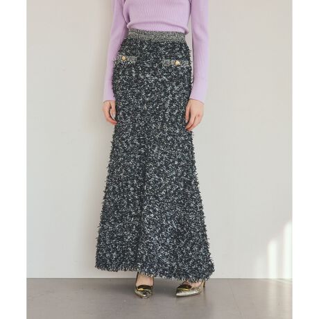 [型番:0226123044]リボンヤーンやループヤーンなど4種類の糸で編み立てたツイーディーニットロングスカート。同シリーズでおつくりしたツイーディーニットジャケット【品番:0226153044 】のご用意もございます。※こちらのモデル着用画像はサンプル品を撮影しております。実際の商品と仕様、加工、サイズが若干異なる場合がございます。予めご了承くださいませ。