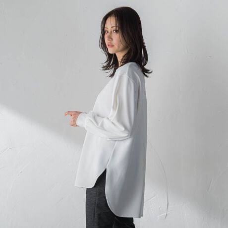 一枚でも重ね着でも着用でき、ジャケットインにも最適な万能ブラウス。