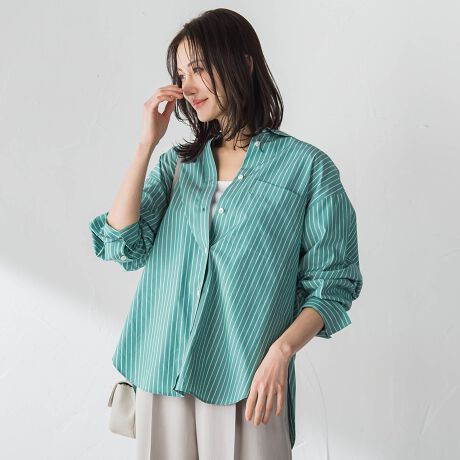 春らしいカラーが映える、きちんと感のある襟付きストライプシャツ。