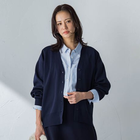 スカートと合わせた際にもバランスよく着用できるよう、前後差をつけたシルエットに仕上げたVネックカーディガン。