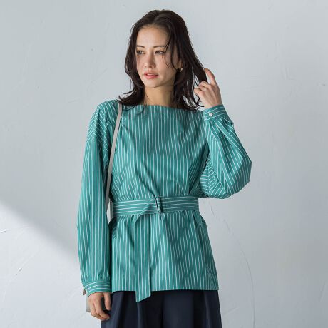 ベルトを付けても外しても着用できる、着こなしの幅が広がる2WAYデザインのブラウス。