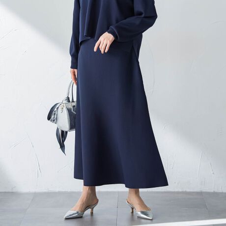 同素材のカーディガンやニットと合わせて、セットアップ風の着こなしが楽しめるフレアニットスカート。