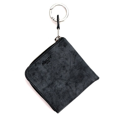 コンパクトなのに大きく開くL字ファスナーショートウォレットです。L字ファスナー+マチで、本体がガバっとトレー状に大きく開きます。縫製を極力減らし、構造をシンプルにすることで仕切りの可動域を広げており、入れるものを変えても柔軟に対応することができます。中央の大きく開くトレー状のスペースには小銭がじゃらっと入ります。仕切りと本体の高さの差を1円玉以下にすることで、仕切りの上が開いたままでも小銭がほかのスペースに移動してしまうのを抑えています。小銭入れ仕切りの左側のスペースにはカードが5〜8枚程度収納可能(縦向き/横向き可)、右側のスペースには2つ折りにした紙幣が入ります。ファスナーヘッドについている着脱可能なリングカラビナには鍵などをつけておくことができます。バッグやストラップなどにさげて使うにも便利です。