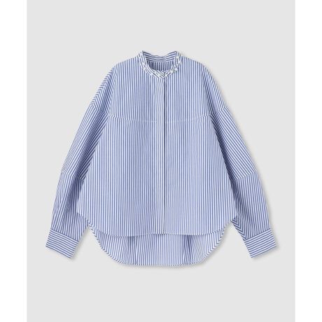 さわやかなボーダー柄が軽やかな印象を与え、首元にあしらった大小異なるパールが、華やかさと上品さをプラス。