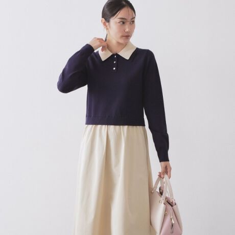 ・トップス部分はポロ衿を配色のレイヤードデザインにしており、トレンド感をプラス。