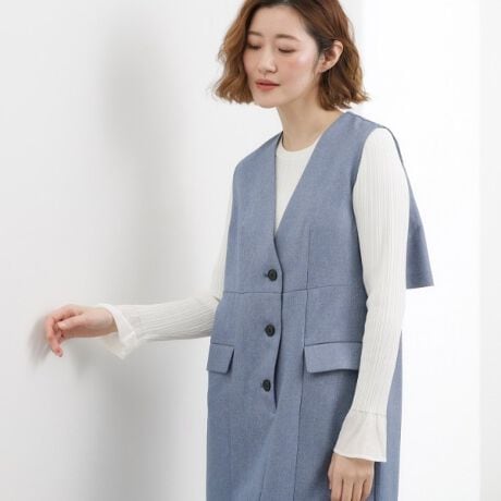 高めのウエスト切り替えとVネックデザインで、前後どちらから見てもすっきりとしたスタイルアップを叶えます。