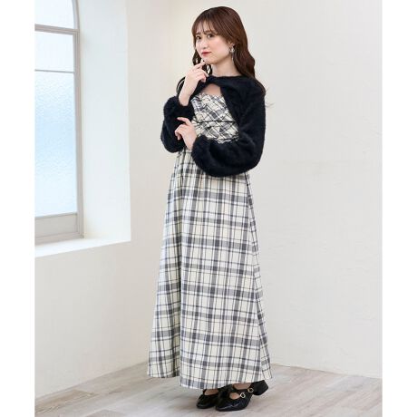 ニットボレロはショート丈、キャミワンピースはハイウエストの切り替えで、足長効果を期待できます。