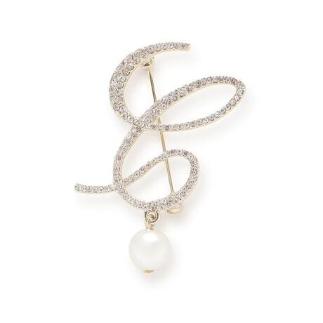流れるようにエレガントなシルエットのCロゴに、ゆらゆら揺れるアクセントのパールを1粒つけたビジューブローチ。
