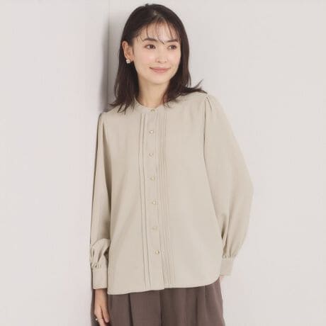 フロントのピンタックデザインにゴールドのボタン使いが上品で華やかなブラウス。