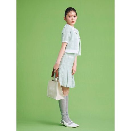 繊細なチェック柄の半袖カーディガンとミニニットワンピースのセットアイテム。