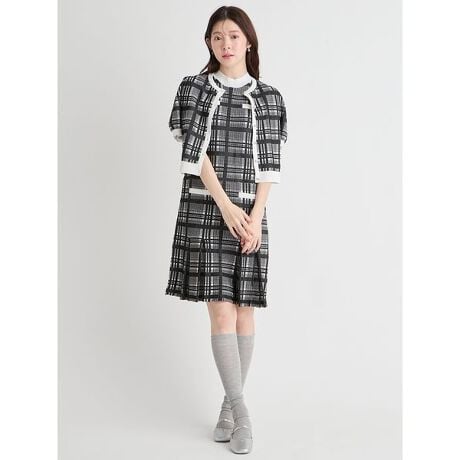 繊細なチェック柄の半袖カーディガンとミニニットワンピースのセットアイテム。