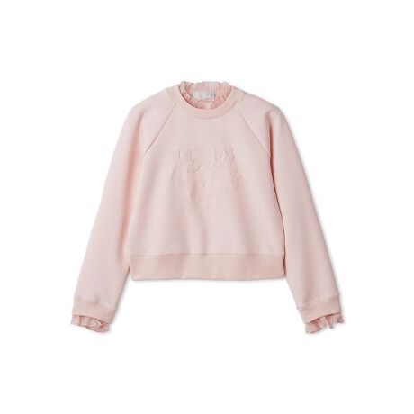 襟ぐりと袖からちらりと覗くフリルとカレッジ風ロゴがキャッチーなスウェットプルオーバー。
