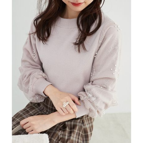 フェミニンムード高まるチュール刺繍×パールニット