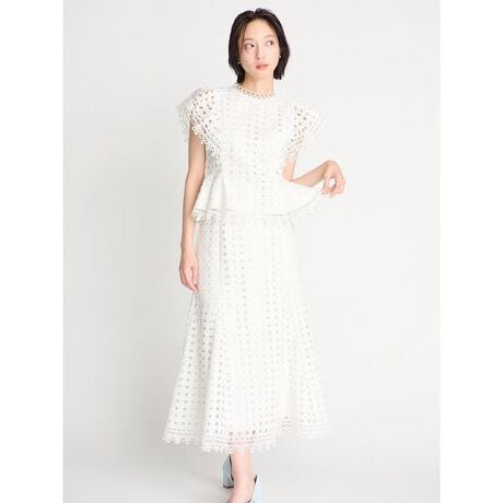 ジオメトリック柄のオリジナルレースを贅沢に仕立てたスカートは、美しいマーメイドシルエットが女性らしい曲線を描き、裾に向かって広がる分量感が華やかな印象を添えます。