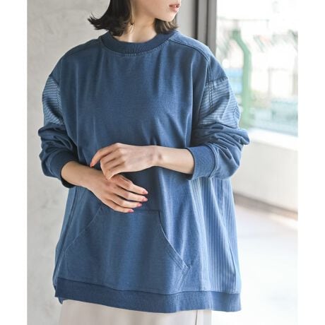 裏毛デニム×ストライプのカジュアルトップス