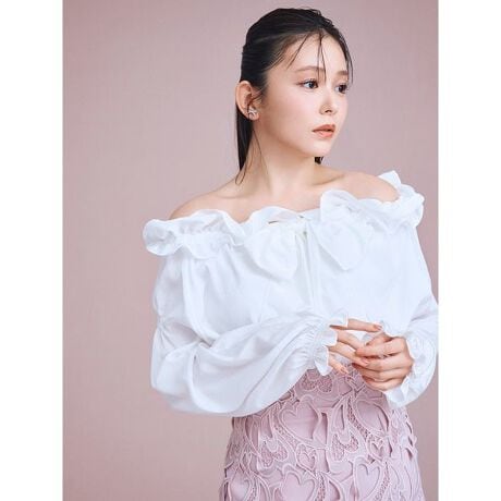 襟ぐりにふんだんにあしらったフリルとハリのあるタフタ素材のビッグリボンが顔回りを華やかに演出。タックインでもアウトでも着やすい丈感です。