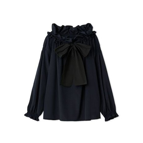 襟ぐりにふんだんにあしらったフリルとハリのあるタフタ素材のビッグリボンが顔回りを華やかに演出。タックインでもアウトでも着やすい丈感です。