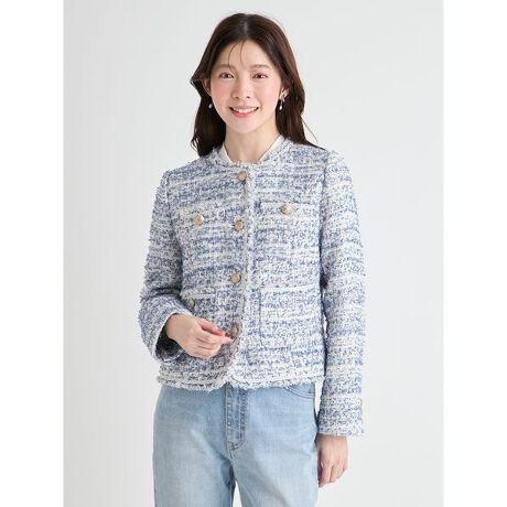 カラフルな糸を織り交ぜたミックスツイードで仕立てたジャケットは、クラシックな雰囲気にフリンジを効かせてほどよい抜け感をプラス。中にボウタイ付きブラウスを合わせれば、旬のレイヤードスタイルも手軽に楽しめます。
