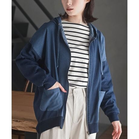 裏毛デニムと布帛の切り替えパーカー