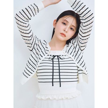 インナーの身頃は透けないメッシュ編みで編み上げ、襟元にリボンを通すなど、さまざまなきゅんとするデザインポイントを加えた、それぞれ単品でも気映えするアイテムです。